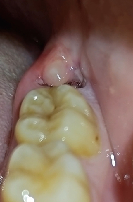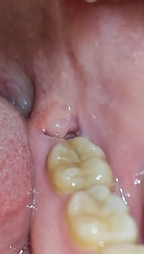 Ik mag vanaf morgen pas beginnen met er in spoelen maar ik voel een irritatie bij het gebied zitten en zag nu deze bult. Is dit herstellende tandvlees of toch een klein abces? (gezien het witte aan de binnenkant) ook heb ik een wat nare smaak in mijn mond.