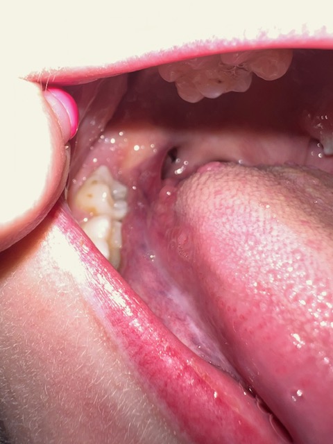 Dit kunnen blaasjes v speeksel zijn maar zo zie ik niets abnormaal. Maar zoals eerder geschreven: Bij twijfel in de mond laten inspecteren/voelen eventueel een x-foto.