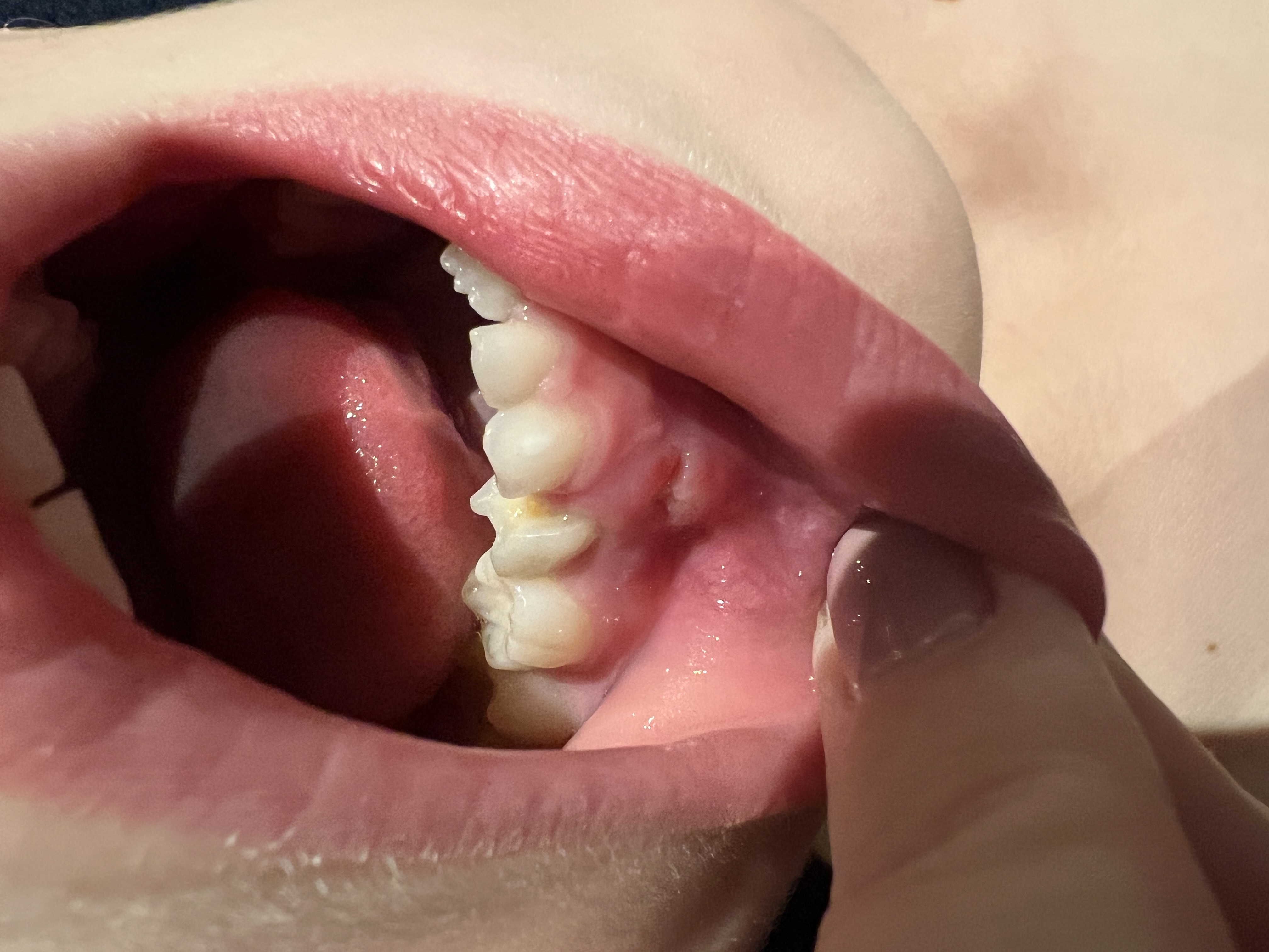 Mijn zoontje gaf aan dat hij een zere plek in zijn mond had. Toen ik ging kijken was het een scheur in zijn tandvlees van ongeveer 6a7 mm. Echter zie ik zijn wortel? zitten.