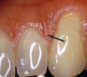 Helaas wanneer twee implantaten naast elkaar geplaatst worden, (met name als deze dicht bij elkaar staan) zal het bot vlak worden en kan het zich ook verder terugtrekken, waardoor er geen botondersteuning meer is voor de vorming van een (driehoekige) tandvleespapil. Overigens kan dit ook gebeuren onder een brug en is het sowieso moeilijk om nu het tandvlees weer symmetrisch te maken. In hoeverre dit een probleem is, is o.a. afhankelijk van het (bio)type tandvlees, de aanwezige hoeveelheid bot, de aanwezige ruimte voor het plaatsen van implantaten en hoeveel je van je tandvlees laat zien bij spreken/lachen.