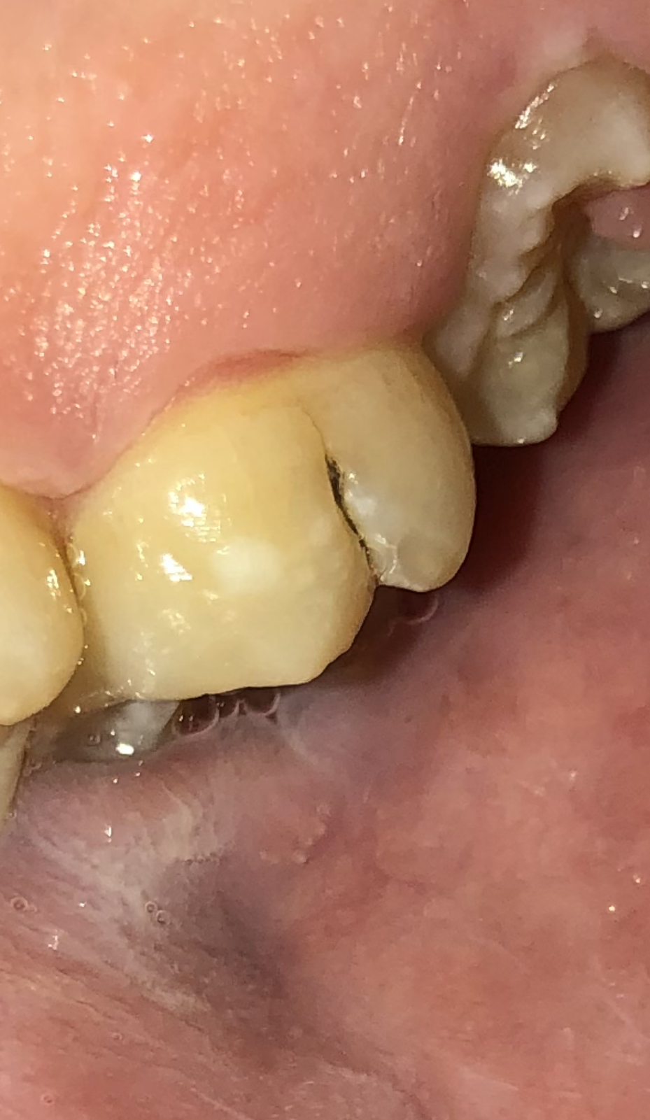 Ik ben 25 en al 7 jaar niet bij de tandarts geweest. Ik snap dat dit erg is en ik schaam me er erg voor, en ben zeker van plan dit zsm te doen (ik ga begin volgende week weer bellen, probeer nu eerst mijn gedachten hiervoor op een rijtje te krijgen). Recentelijk viel me deze donkere lijn op een kies op, na een foto te maken zie ik echter ook een gekleurde lijn tussen de cariës en mijn tandvlees. Mijn vraag is nu of dit een breuk is, en zo ja, is dit mogelijk te repareren of is deze tand zo goed als verloren te beschouwen.