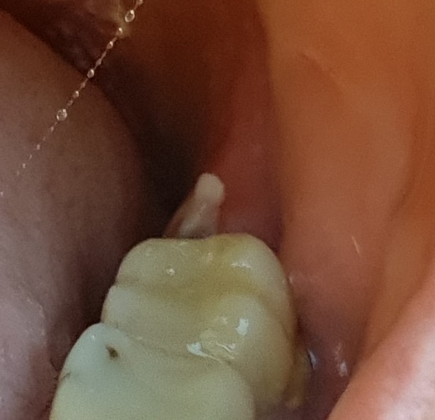 Nu, 2 dagen later is het nog steeds gevoelig. Als ik mijn kiezen op elkaar druk voelt het pijnlijk. Als ik nu naar het plekje achter mijn kies kijk is het wit geworden, en met mijn tong voelt mijn tandvlees kapot aan.