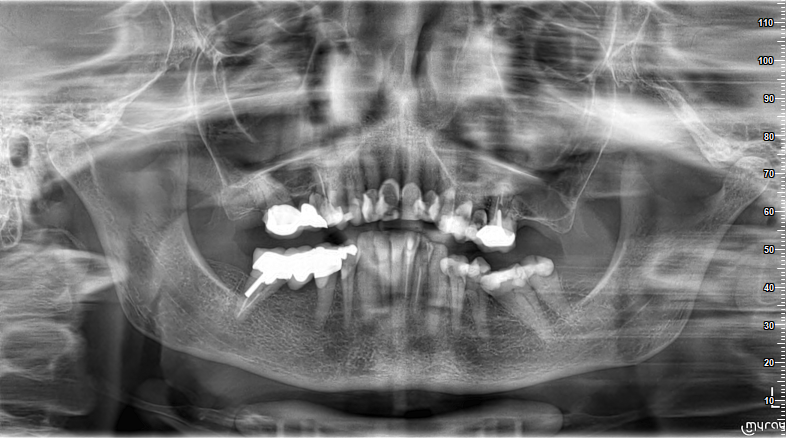Beste tandarts Richard, ik heb nog een vraag: die oude brug rechtsonder (zie eerdere foto 48, 47, 46) Die achterste kies is soms pijnlijk, (al 4 jaar) en dan weer weken niet. Misschien is het die pin die scheef staat die steekt in het bot, misschien zit er cariës onder die kroon. Wat zou u doen? Hoe kun je die achterste kies (wortels zijn morsdood) behandelen/openboren zonder dat de hele brug zijn functie verliest?