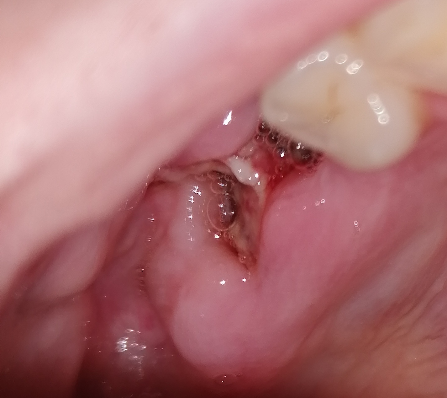 2 achterste kiezen laten trekken, daaronder zat verstandskies die meteen meegenomen is, meteen een uur na het trekken, voelde ik een hard iets met mijn tong, nu 4 dagen later zie ik dat het een stuk kies is?? Of iets anders?? Is dit normaal? Wat moet ik hiermee? Het doet overgings geen pijn. Wel flink gezwelt, wang lijkt wel aan kaak vast te zitten (flinke zwelling in did plooi)