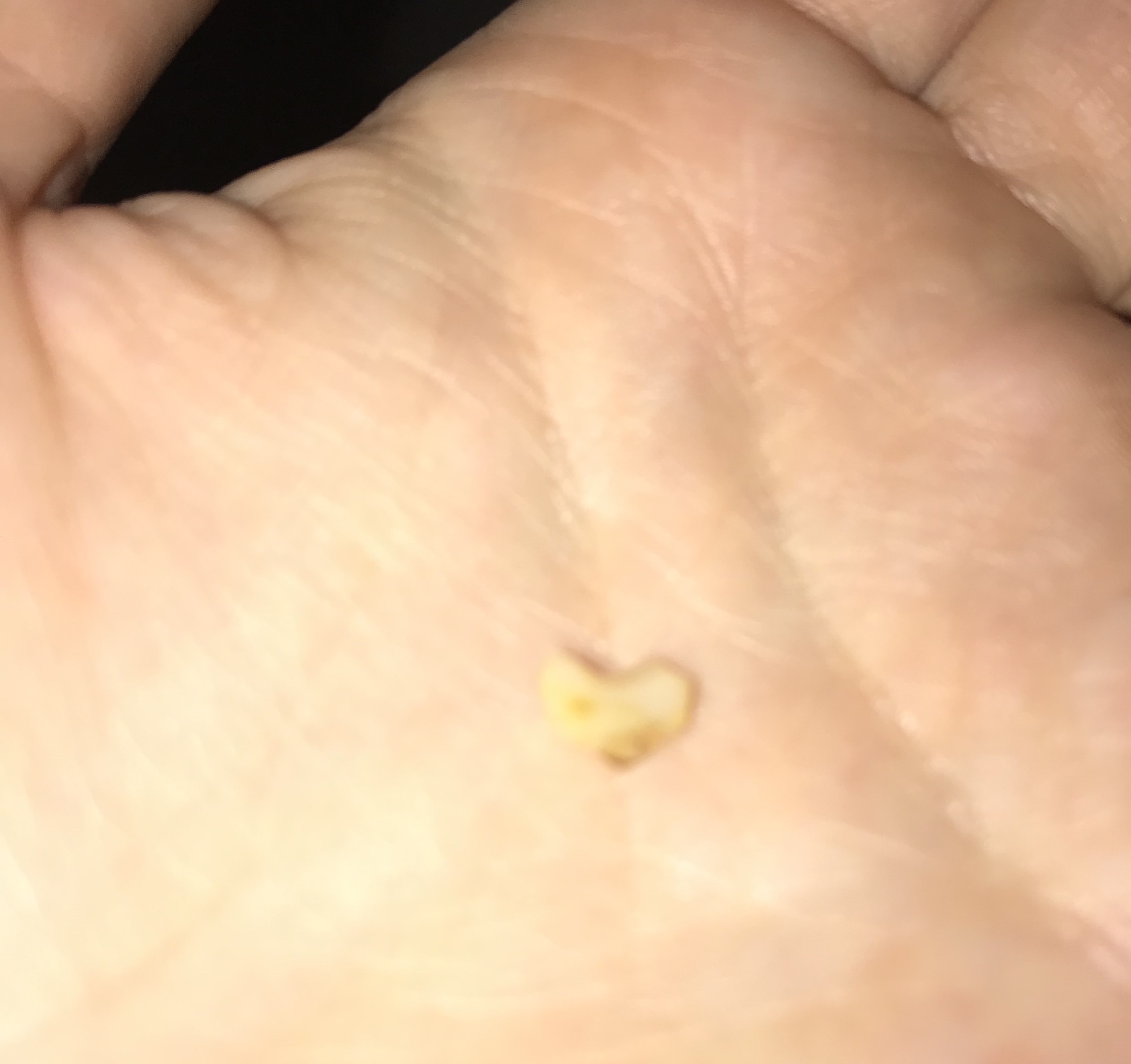 Ik ben inmiddels op dit moment 3 bijna 4 weken verder sinds de extractie. Ik spoel sindsdien met Lysterine Zero. De geur is minder heftig dan voorheen, nogsteeds aanwezig. Ik wil nogsteeds niet met mijn linker kies kauwen. Ik voel steeds iets tussen mijn twee achterste kiezen zitten. Met het stokeren tik ik het aan maar het komt maar niet los. Vanavond om 21:15 besluit ik dat ik het zat ben en wil weten of iets tussen mijn tanden vast zit, zaklamp op de plank en met de spiegel gewapend begin ik van beide kanten te flossen, ineens springt een halve hoek van mijn linker zeurende kies uit mijn gebit. Ik ruik aan dit stuikje tand en ruik duidelijk de bekende nare geur. Nu zie ik ook nog een zwarte stip op de afgebroken hoek en vermoed dat het (in mijn ogen) is verrot.