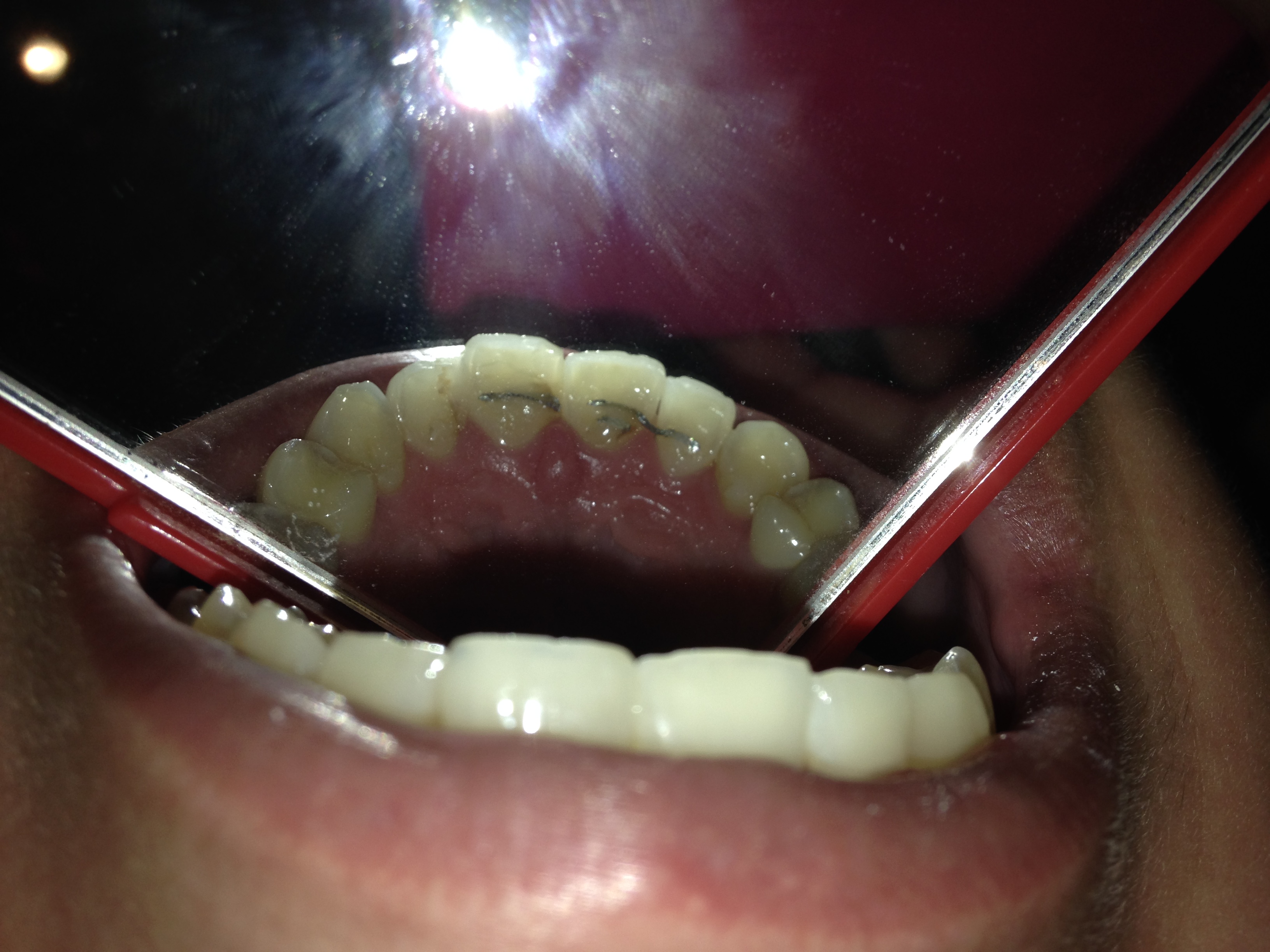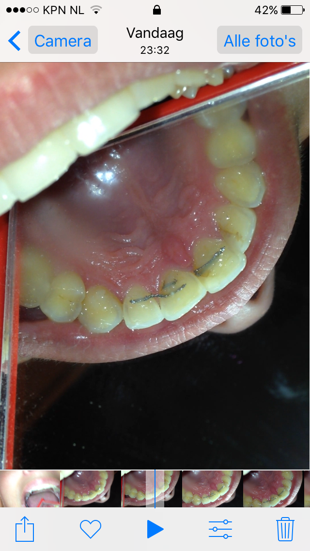 Nu dronk ik gisteren zoals gewoonlijk weer mijn cola maar ik merkte dat de tand naast mijn linker voortand bovenaan een beetje zeer deed. Niet mega veel pijn ofzo maar het was wel aanwezig en het voelde niet prettig. Nu dacht ik dat dat wel zou komen door de frisdrank dat heb ik weleens vaker dat mijn tanden gevoeliger worden. Maar ik keek net met een spiegeltje in mijn mond en scheen er met een zaklamp op en toen schrok ik wel een beetje. Misschien hoef ik mij wel helemaal niet druk te maken maar ik vond het er niet heel goed uitzien. Want de tand waarvan ik last had was een beetje bruinig uitgeslagen en het leek alsof dat bruine in een scheur naar beneden trok. Ook toen ik er met een nagelschaartje in dat bruine dingetje heen en weer bewoog voelde ik weer die lichte steek/ pijn. Sowieso zijn mijn tanden aan de achterkant een beetje gelig en lopen ze wat holler door de erosie maar ik merkte ook op dat er ook een deel bij mijn Spalkje was die ook een beetje bruinig was uitgeslagen.