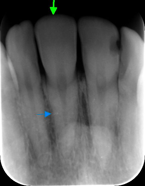 De tand is aangeduid met de groene pijl. Het betreft een voortand in de bovenkaak.