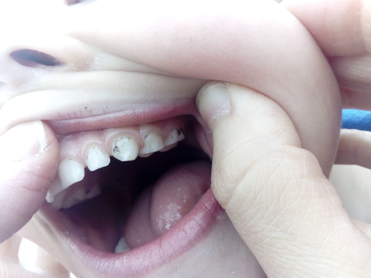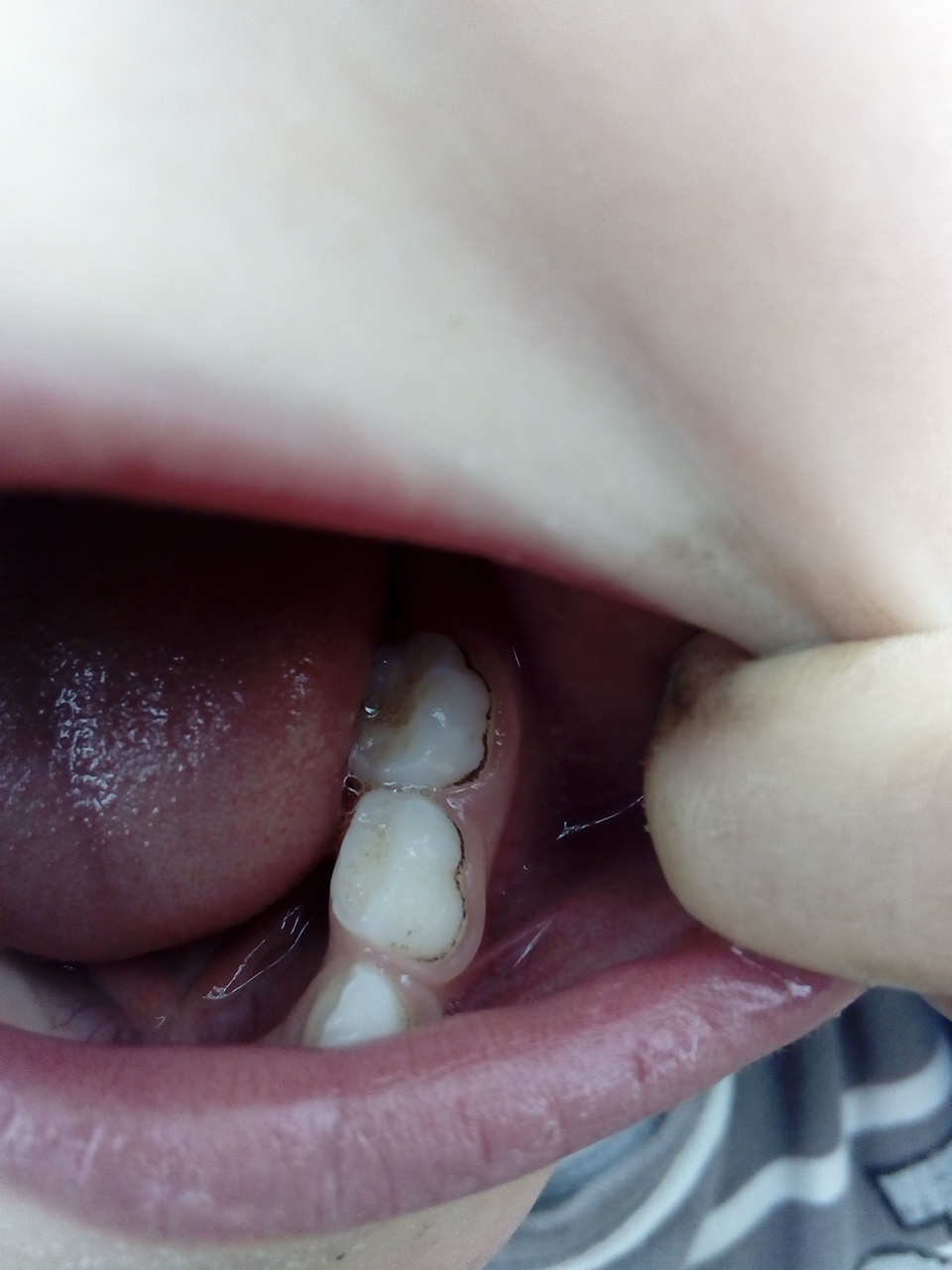 Ons zoontje van 5 jaar heeft langs de tandranden allemaal zwarte stippen, zie de bijgevoegde foto's, de foto's zijn al wat ouder want inmiddels is het behoorlijk erger geworden.