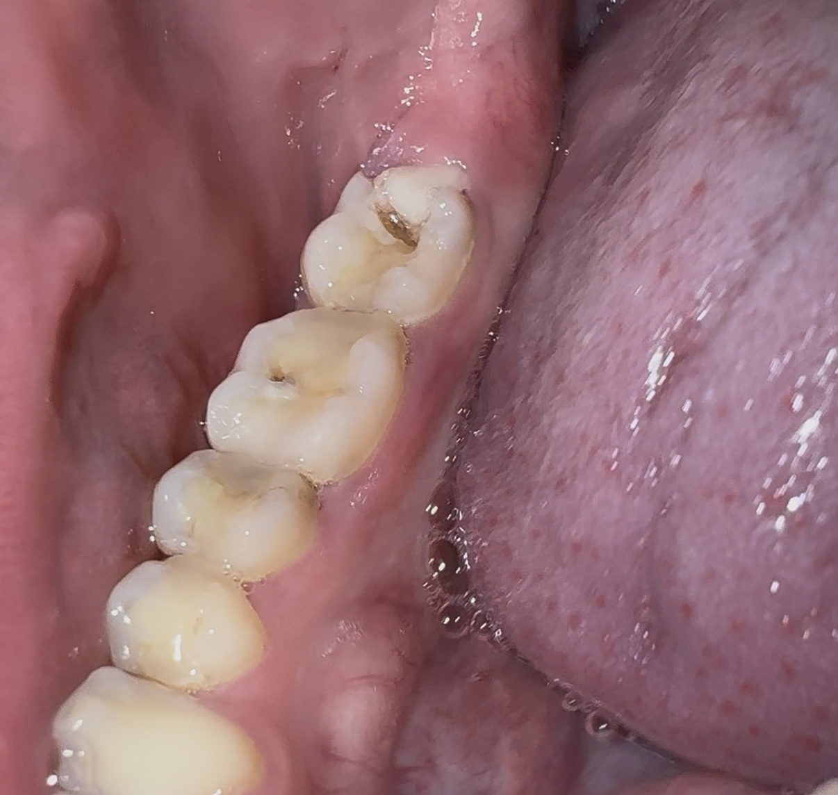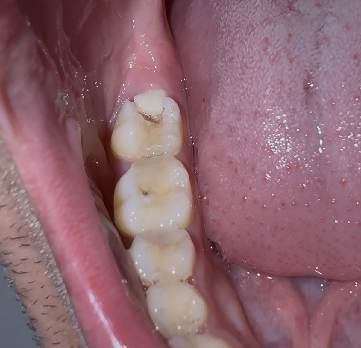 Ik heb momenteel geen pijn aan de kies, er blijven echter voedselresten in achterzitten, waardoor ik mijn kaak niet goed kan sluiten zonder de kies goed schoon te maken.