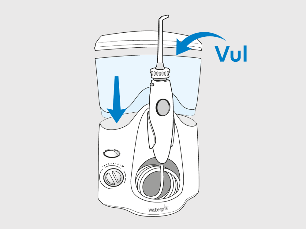 - Begin op de laagste druk en schakel het apparaat in, verhoog de druk geleidelijk tot het flossen comfortabel voelt